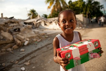 Décore une boite à chaussure (dessus et dessous séparément pour pouvoir l’ouvrir) et remplit la de choses utiles et agréables comme du matériel d’école (cahiers, crayons, gomme, taille crayons…), des jouets, cordes à sauter, yoyos, balles, ballons, des petits instruments de musique, des vêtements, casquettes, tongs, des jumelles, du dentifrice, une brosse à dent, du savon…( mais PAS de liquide- sauf shampoing et savon à bulles- pas de jouets de guerre, pas d’objets avec des piles et pas de nourriture… ni même friandises).
